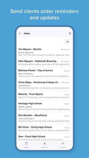 Printavo เป็นซอฟต์แวร์การจัดการร้านค้าที่ออกแบบมาเพื่อช่วยให้ผู้พิมพ์หน้าจอ ผู้ปักป้าย ผู้ผลิตสิ่งที่สร้างสรรค์ และบริษัทผู้ผลิตสินค้าโปรโมชั่นเก็บรวบรวมข้อมูลได้อย่างเป็นระเบียบ ด้วย Printavo คุณสามารถกำหนดตารางงาน ให้ราคาลูกค้า ได้รับการอนุมัติงานศิลปะ และติดตามคำสั่งซื้อในกระบวนการทำงานของคุณ ทั้งหมดนี้อยู่ในระบบคลาวด์ แอปพลิเคชันนี้ช่วยให้คุณสามารถดำเนินธุรกิจของคุณได้ทุกที่ ให้ความสะดวกและความยืดหยุ่น